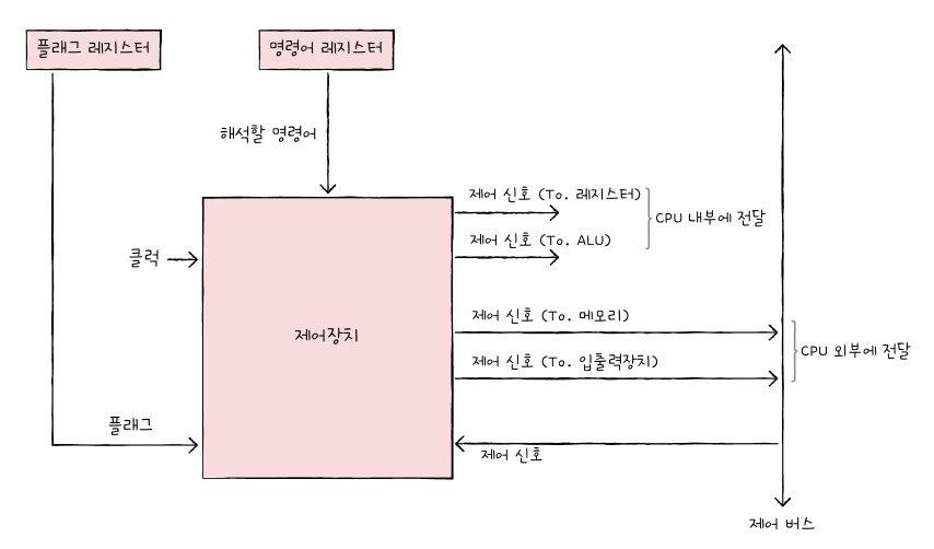 - 해석해야 할 명령어: 명령어 레지스터로부터 명령어를 받아서 해석한 후, 제어 신호를 발생시켜 다른 부품들에게 수행할 일을 알림