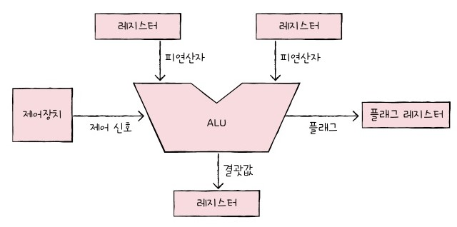 레지스터를 통해 피연산자와 제어장치로부터 제어 신호를 받고 연산 수행 후, 결괏값을 레지스터에 저장