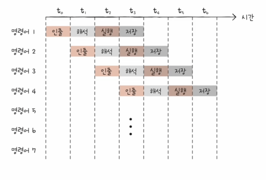 명령어를 동시에 처리하여 CPU를 쉬지 않고 작동시키는 기법이다