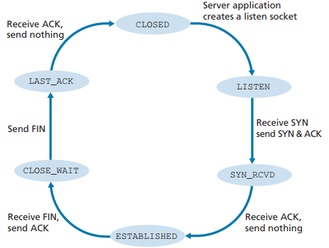 - SYN 세그먼트를 받은 서버 TCP는 연결에 TCP 버퍼와 변수를 할당한다. 그리고 클라이언트 TCP에게 연결 승인을 알리는 SYNACK 세그먼트를 송신한다. 이 세그먼트에도 마찬가지로 최초의 순서 번호를 임의로 선택하여 포함한다