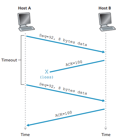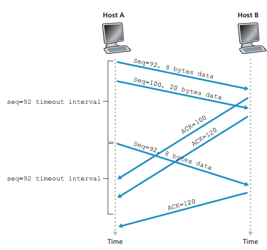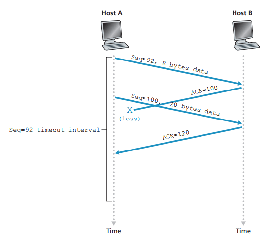 그러나 첫 번째 세그먼트의 타임아웃 이전에 두 번째 세그먼트의 확인 응답이 도착하면 A는 B가 119바이트까지 모든 데이터를 수신했음을 알고 어느 것도 재전송하지 않는다