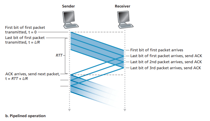 프로토콜 rdt3.0은 기능적으로는 정확하지만 전송 후 대기 프로토콜이기 때문에 형편없는 송신자 이용률을 가지게 된다