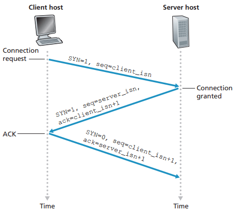 클라이언트가 첫 번째 TCP 세그먼트를 보내고, 서버가 응답으로 두 번째 TCP 세그먼트를 보내고 마지막으로 클라이언트가 세 번째 TCP 세그먼트를 보내서 연결을 설정한다 (세 방향 핸드셰이크)