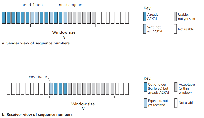 - [0, base-1]에서 순서 번호는 이미 전송되고 확인응답이 된 패킷