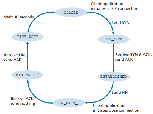 - SYNACK 세그먼트를 수신한 클라이언트는 연결에 버퍼와 변수를 할당한 후 마지막으로 서버에 연결 승인 세그먼트를 송신한다. 이 때 세그먼트에 데이터를 포함할 수 있다