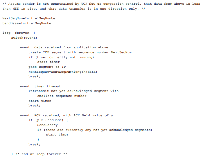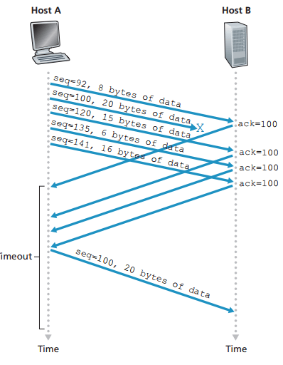 TCP가 SendBase와 NextSeqNum을 유지하는 것은 GBN과 유사하지만, 패킷 분실시 연속적인 패킷을 모두 재전송하는 GBN과 세그먼트 하나만을 재전송하는 TCP는 차이가 있다