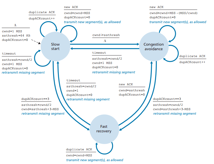 이 알고리즘은 슬로 스타트, 혼잡 회피, 빠른 회복 세 가지 구성요소를 가진다
