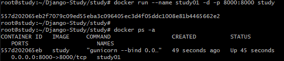 docker run --name [컨테이너 이름] -d -p 8000:8000 [프로젝트 이름]으로 컨테이너를 만들고 이미지를 실행합니다