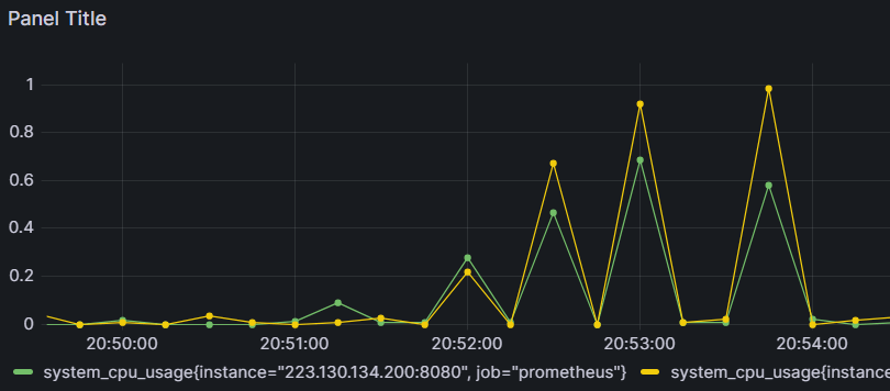 그라파나의 CPU 사용량 그래프를 보면 두 서버의 CPU가 동일한 모양을 띄고 있는 것을 볼 수 있다