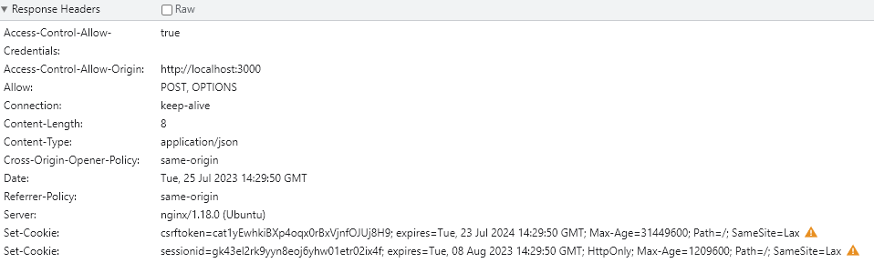 다시 로그인 요청의 응답 헤더를 보면 노란색 세모가 사라져있다